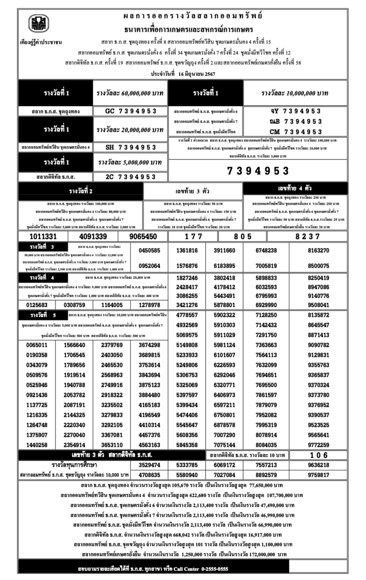 ตรวจสลาก ธ.ก.ส. งวดวันที่ 16 มิถุนายน 2567